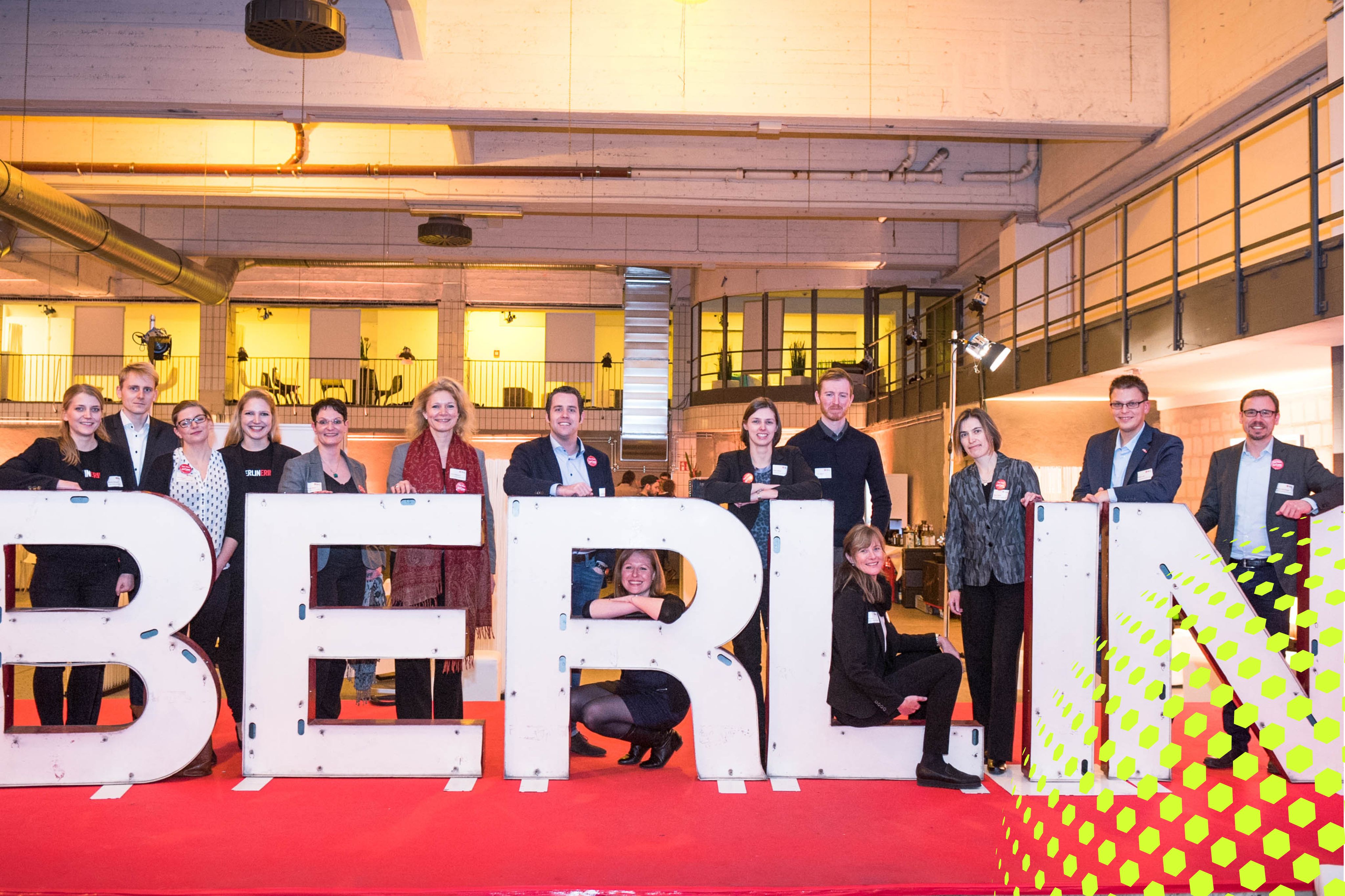 Gruppe von Menschen hält Schilder mit „Berlin Event Board“ in modernem Innenraum.