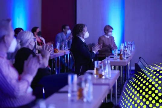 Menschen auf einer Bühne mit Publikum in einem bunt beleuchteten Saal