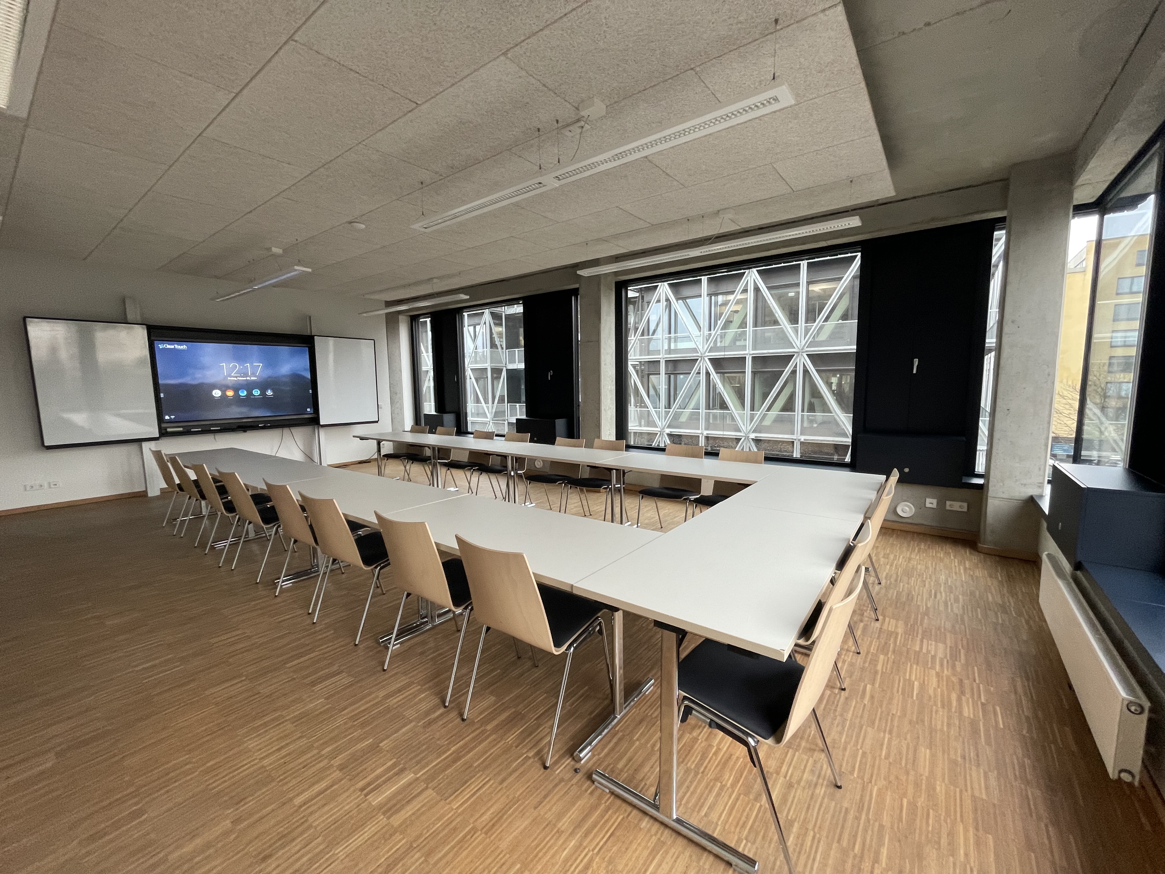 | Raum Large | 360° tour - | Room area 58 m² | Room height 2.70 m | Max. banquet seating 30 | Max. parliament seating 30 | Max. reception seating 48 | Max. row seating 48 | Max. standing seating 48 | Max. U-shape seating 30 |