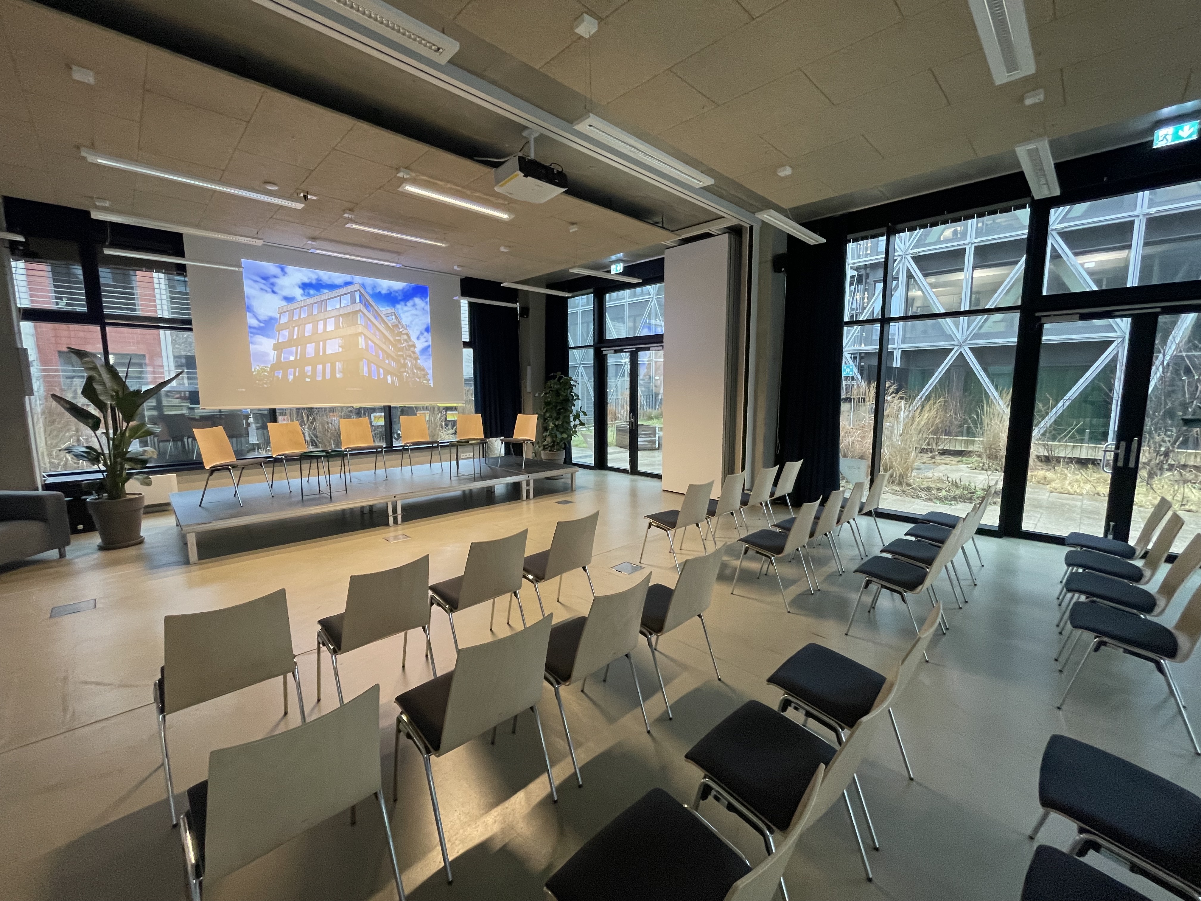 | Plenum | 360° tour - | Room area 131 m² | Room height 3.15 m | Max. banquet seating 40 | Max. parliament seating 56 | Max. reception seating 120 | Max. row seating 120 | Max. standing seating 120 | Max. U-shape seating 40 |