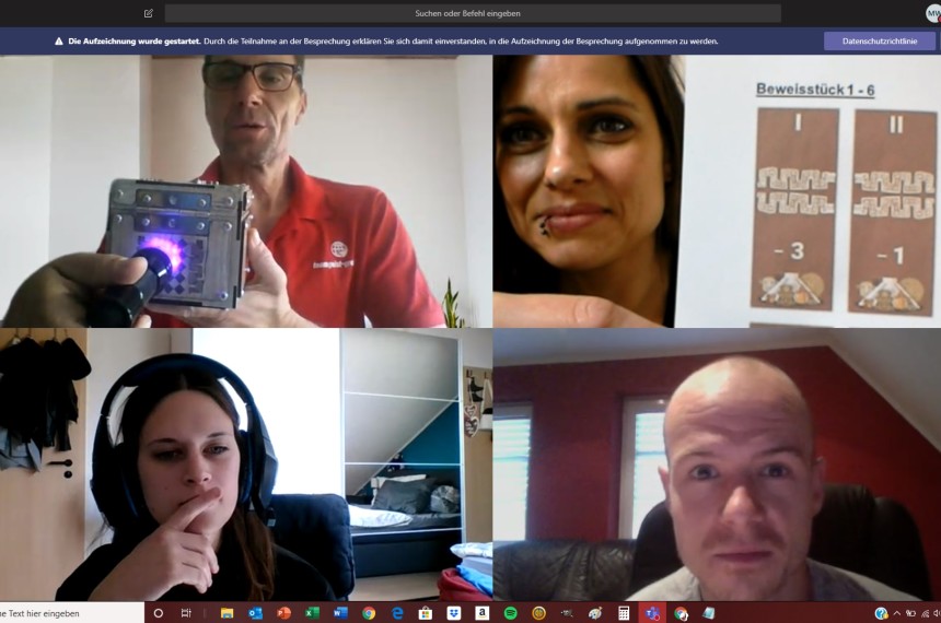 Bei dieser spannenden (über eine App verfügbaren) Geschichte, steht Ihr Team per Videocall miteinander in Verbindung. Die notwendigen Materialien um die Ermittlungen zu beginnen erhalten Sie im Vorfeld übermittelt. Alle Rätsel und Puzzle sind hochwertig digitalisiert und interaktiv.