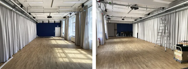 | Seminarraum | 360°-Tour - | Raumfläche 140 m² | Raumhöhe 3.50 m | Max. Bankettbestuhlung 40 | Max. parlamentarische Bestuhlung 50 | Max. Sitzplatzkapazität 50 | Max. Sitzplätze in Reihe 90 | Max. Stehplätze 120 | Max. U-förmige Sitzanordnung 65 |