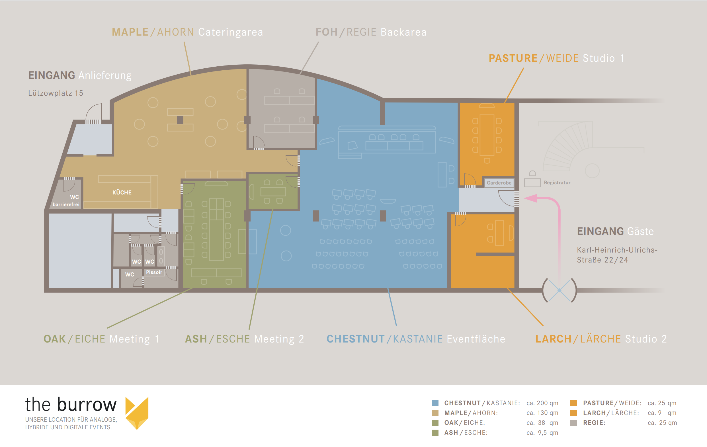 | CHESTNUT / KASTANIE | 360°-Tour - | Raumfläche 200 m² | Raumhöhe 2.90 m | Max. Bankettbestuhlung 50 | Max. parlamentarische Bestuhlung 45 | Max. Sitzplatzkapazität 80 | Max. Sitzplätze in Reihe 80 | Max. Stehplätze 90 | Max. U-förmige Sitzanordnung 27 |