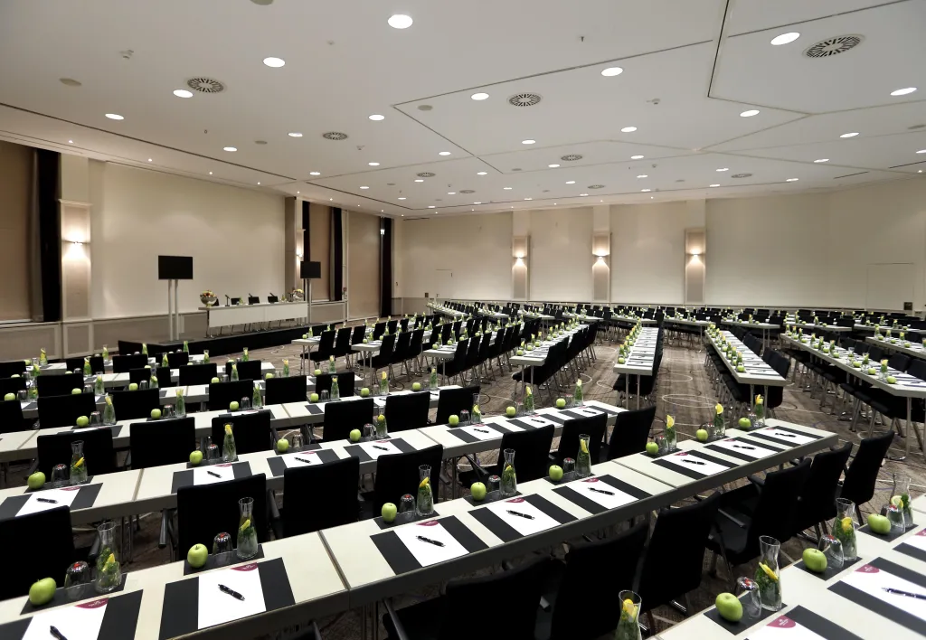| Conference Center | Raumfläche 622 m² | Raumhöhe 4.50 m | Max. Bankettbestuhlung 400 | Max. parlamentarische Bestuhlung 350 | Max. Sitzplatzkapazität 1000 | Max. Sitzplätze in Reihe 600 | Max. Stehplätze 0 | Max. U-förmige Sitzanordnung 0 |
