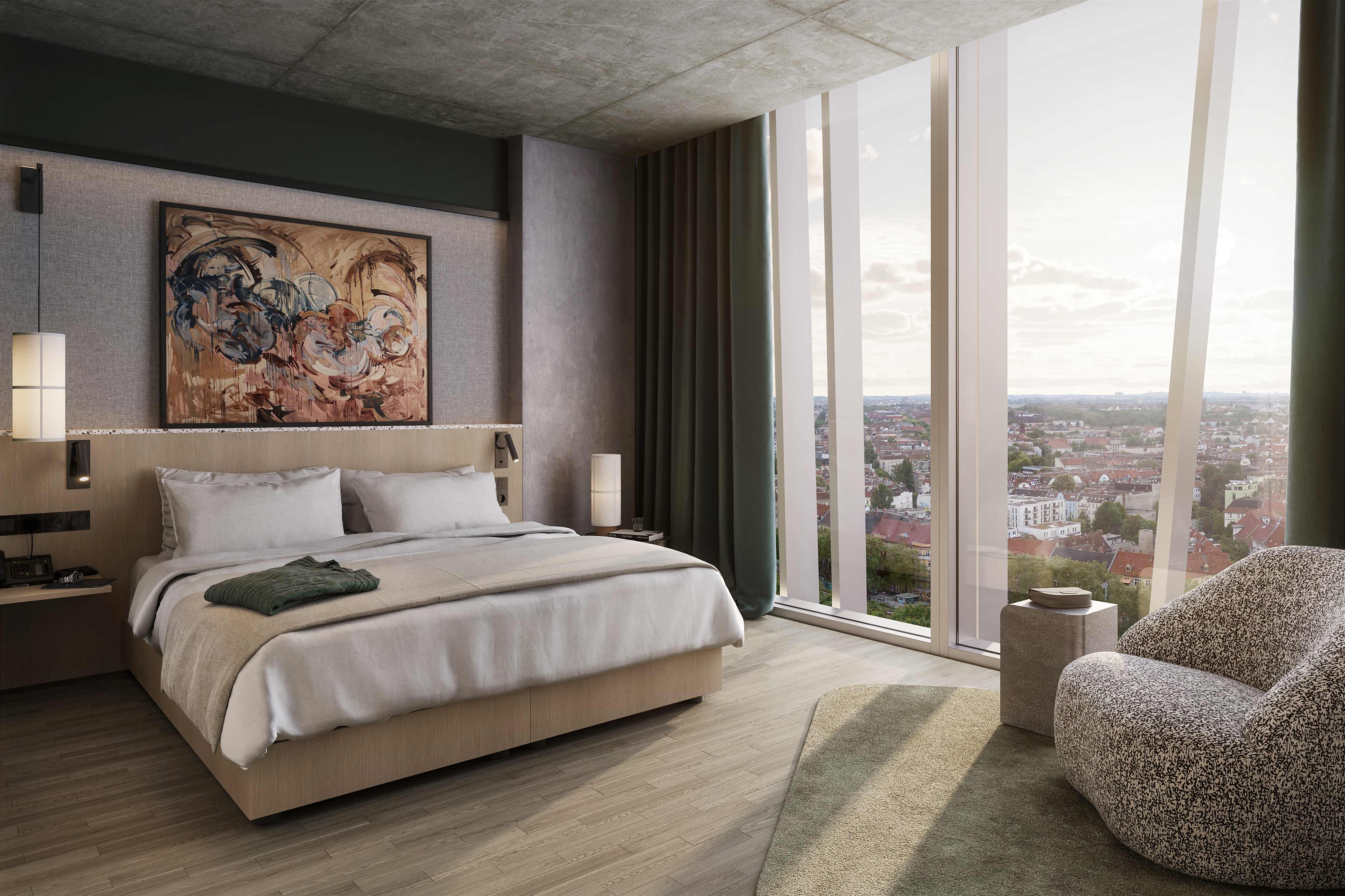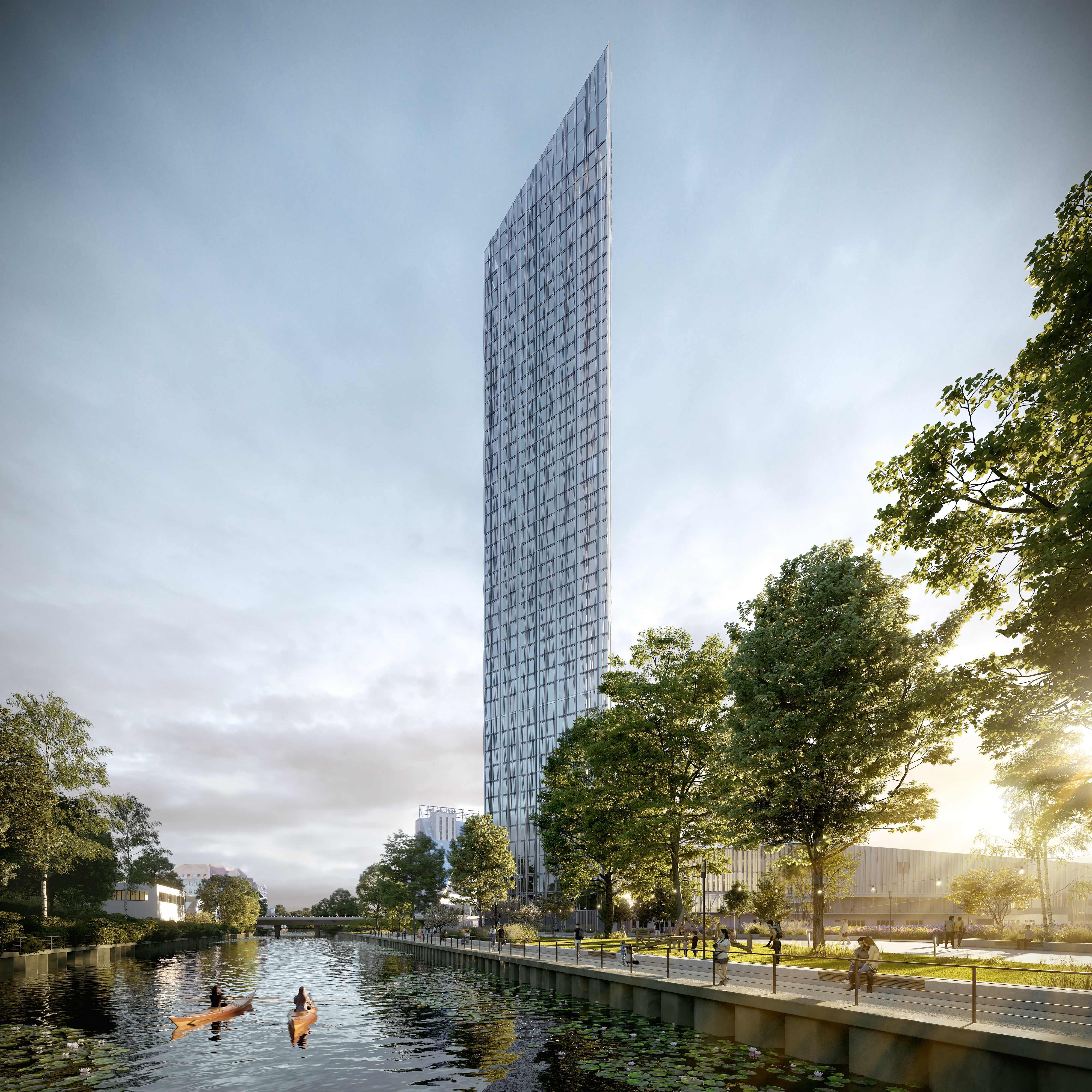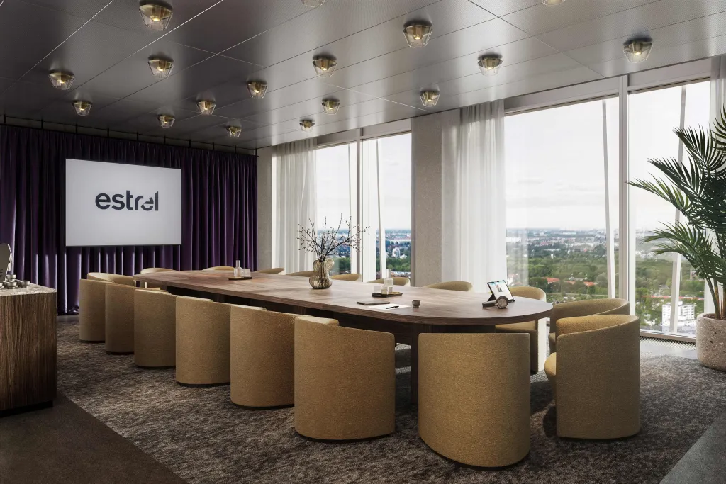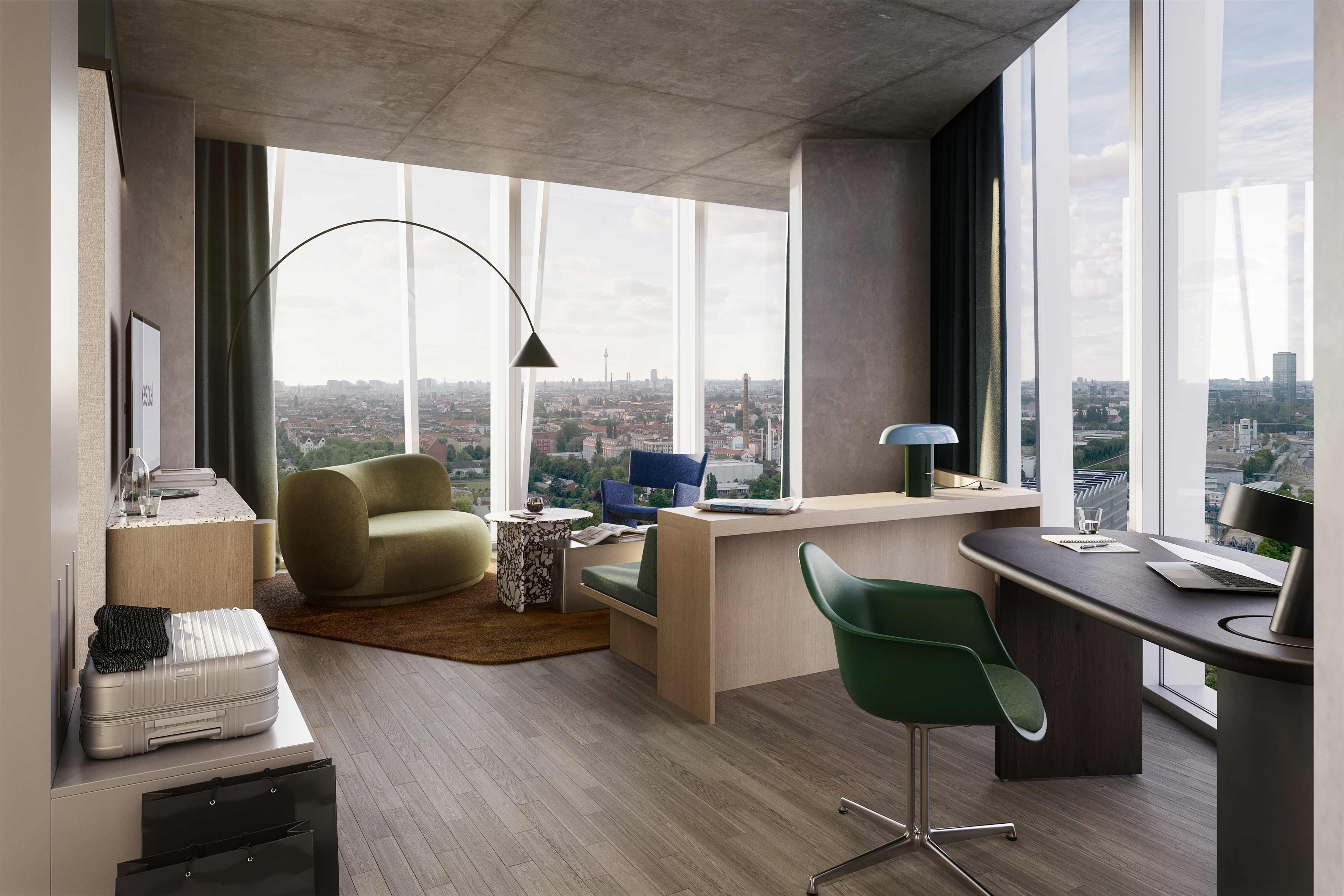 Beim Estrel Tower wurden Umwelt- und Nachhaltigkeitsstandards konsequent in allen Bereichen umgesetzt. Dazu zählen Fernwärme aus erneuerbaren Energien, begrünte Dächer mit integrierten Photovoltaikanlagen, Wildblumenflächen sowie ein neu geschaffener Park am Neuköllner Schifffahrtskanal. Ergänzt wird das Konzept durch ein Parkhaus mit E-Mobility-Ladepunkten und umfangreichen Fahrradstellplätzen. Der Estrel Tower strebt eine LEED®-Platin-Zertifizierung an.