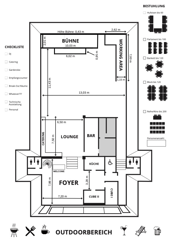 | Forum Factory Berlin | 360°-Tour - | Raumfläche 420 m² | Raumhöhe 6.60 m | Max. Bankettbestuhlung 120 | Max. parlamentarische Bestuhlung 100 | Max. Sitzplatzkapazität 250 | Max. Sitzplätze in Reihe 200 | Max. Stehplätze 250 | Max. U-förmige Sitzanordnung 60 |