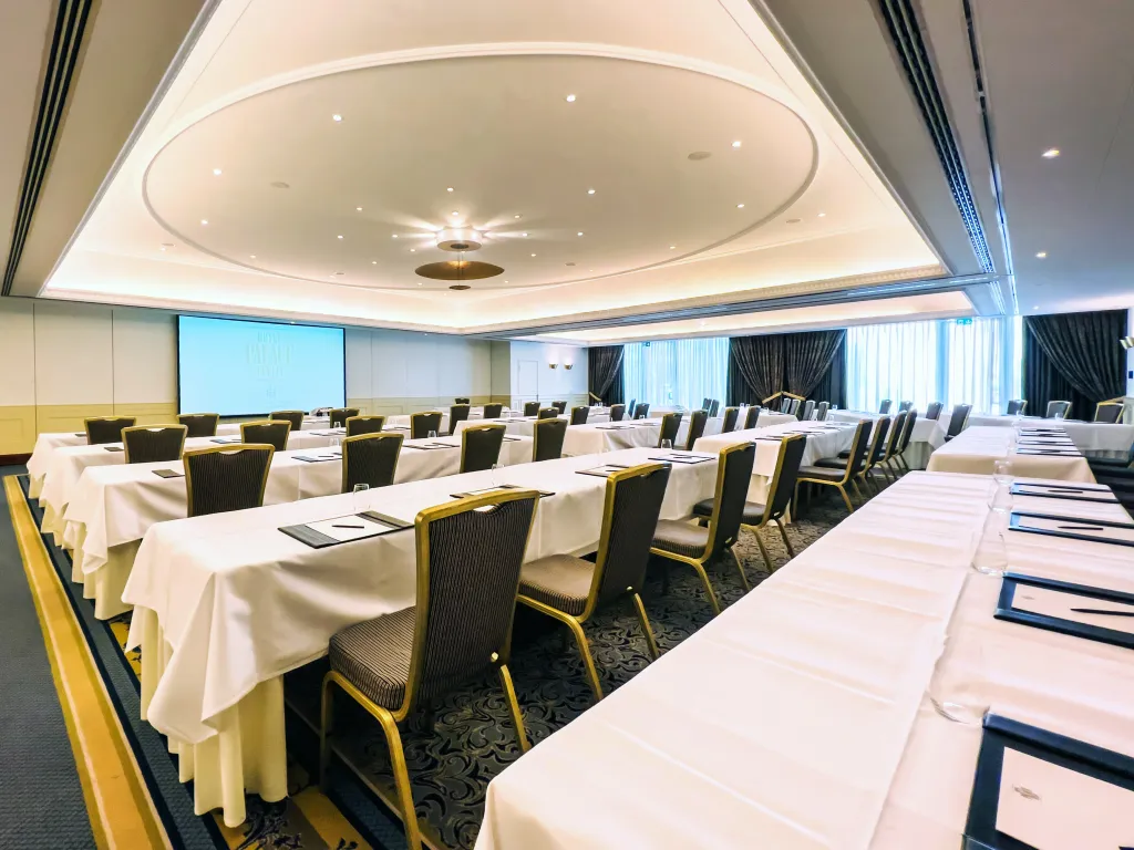 | Europa 5 | Raumfläche 190 m² | Raumhöhe 5.00 m | Max. Bankettbestuhlung 100 | Max. parlamentarische Bestuhlung 120 | Max. Sitzplatzkapazität 200 | Max. Sitzplätze in Reihe 195 | Max. Stehplätze 200 | Max. U-förmige Sitzanordnung 54 |