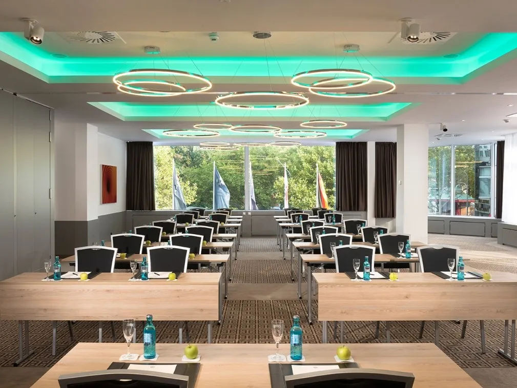 | Berlin 2+3 | Raumfläche 119 m² | Raumhöhe 2.75 m | Max. Bankettbestuhlung 50 | Max. parlamentarische Bestuhlung 51 | Max. Sitzplatzkapazität 70 | Max. Sitzplätze in Reihe 75 | Max. Stehplätze 70 | Max. U-förmige Sitzanordnung 30 |