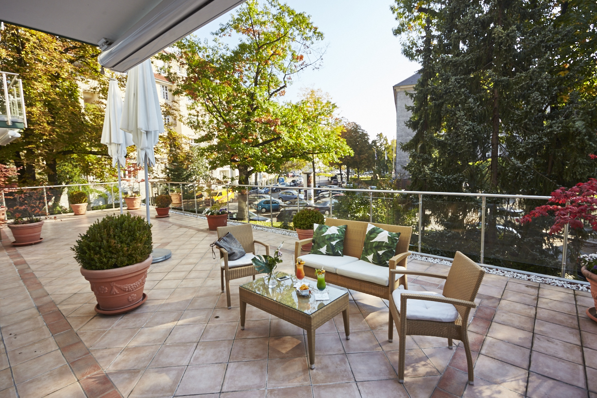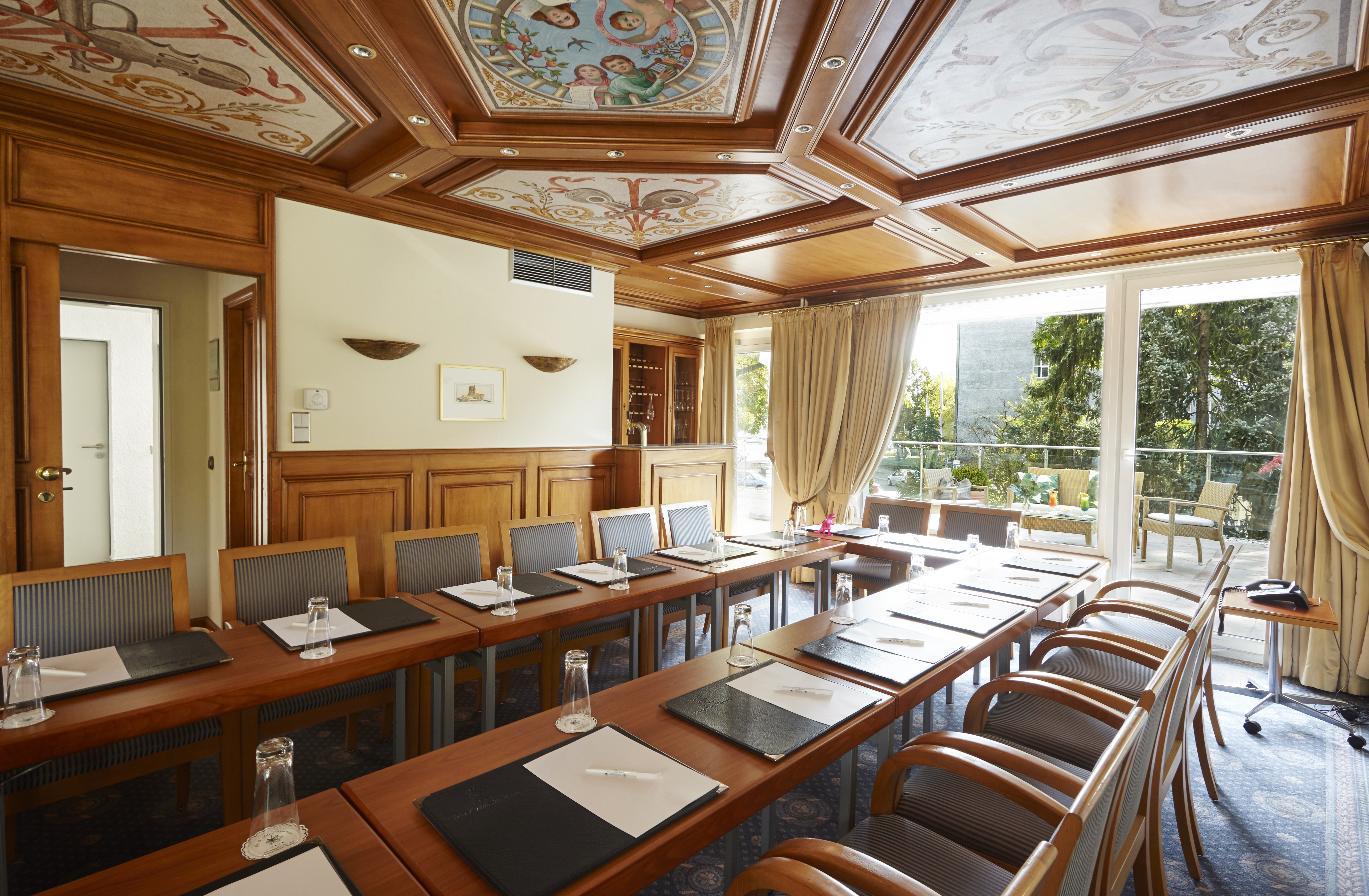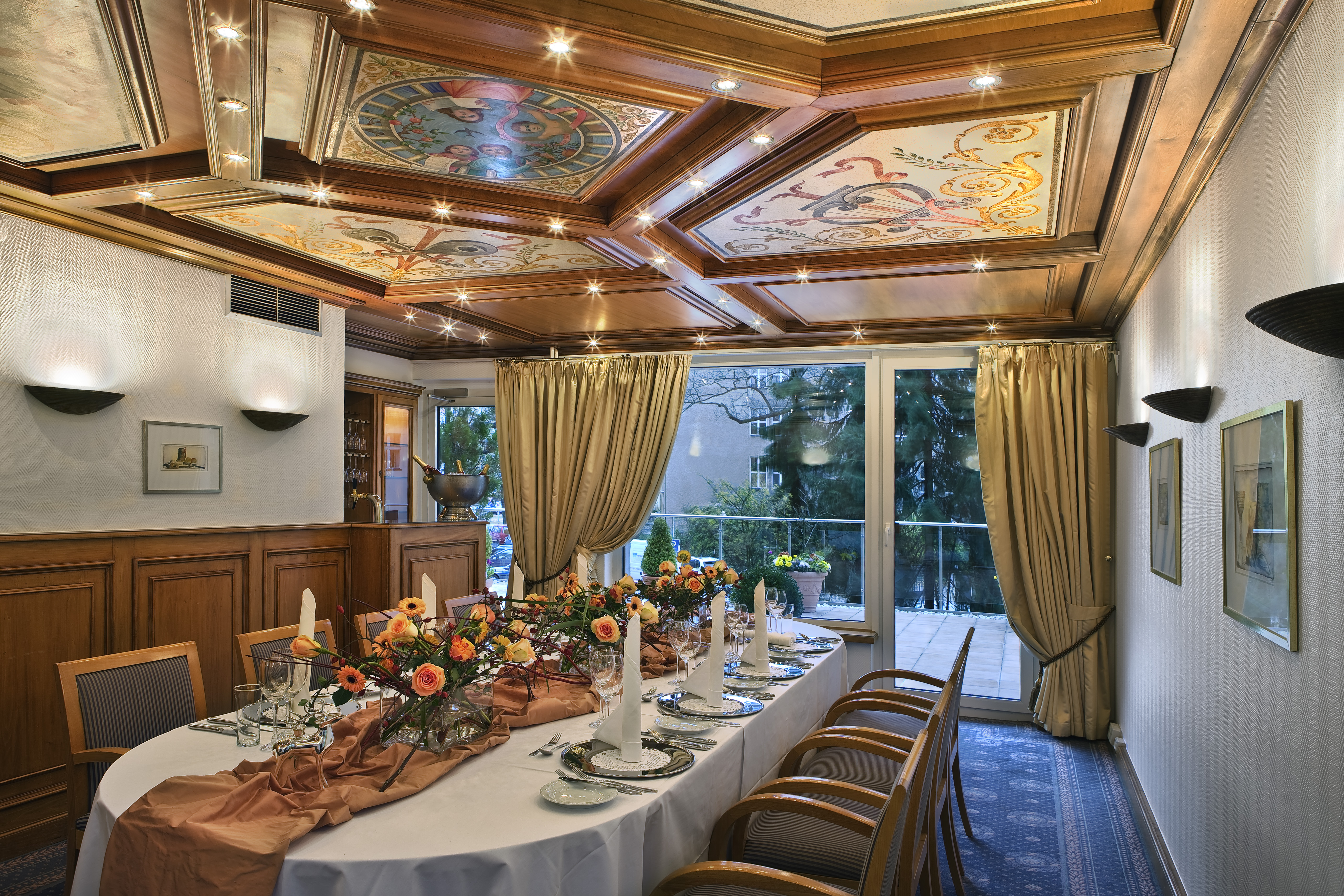 Unser Veranstaltungsraum FRESKO lädt hierzu mit hochwertigem Mobiliar und entsprechender Ausstattung ein: Aufwändige Fresken, edle Hölzer und Stoffe, eine eigene Bar, viel Tageslicht und Ruhe machen diesen Salon zu einem einmaligen Veranstaltungsort. An den im ersten Obergeschoss liegenden Salon grenzt eine 30qm große möblierte Sonnenterrasse, die Ihnen ebenfalls zur Verfügung steht.