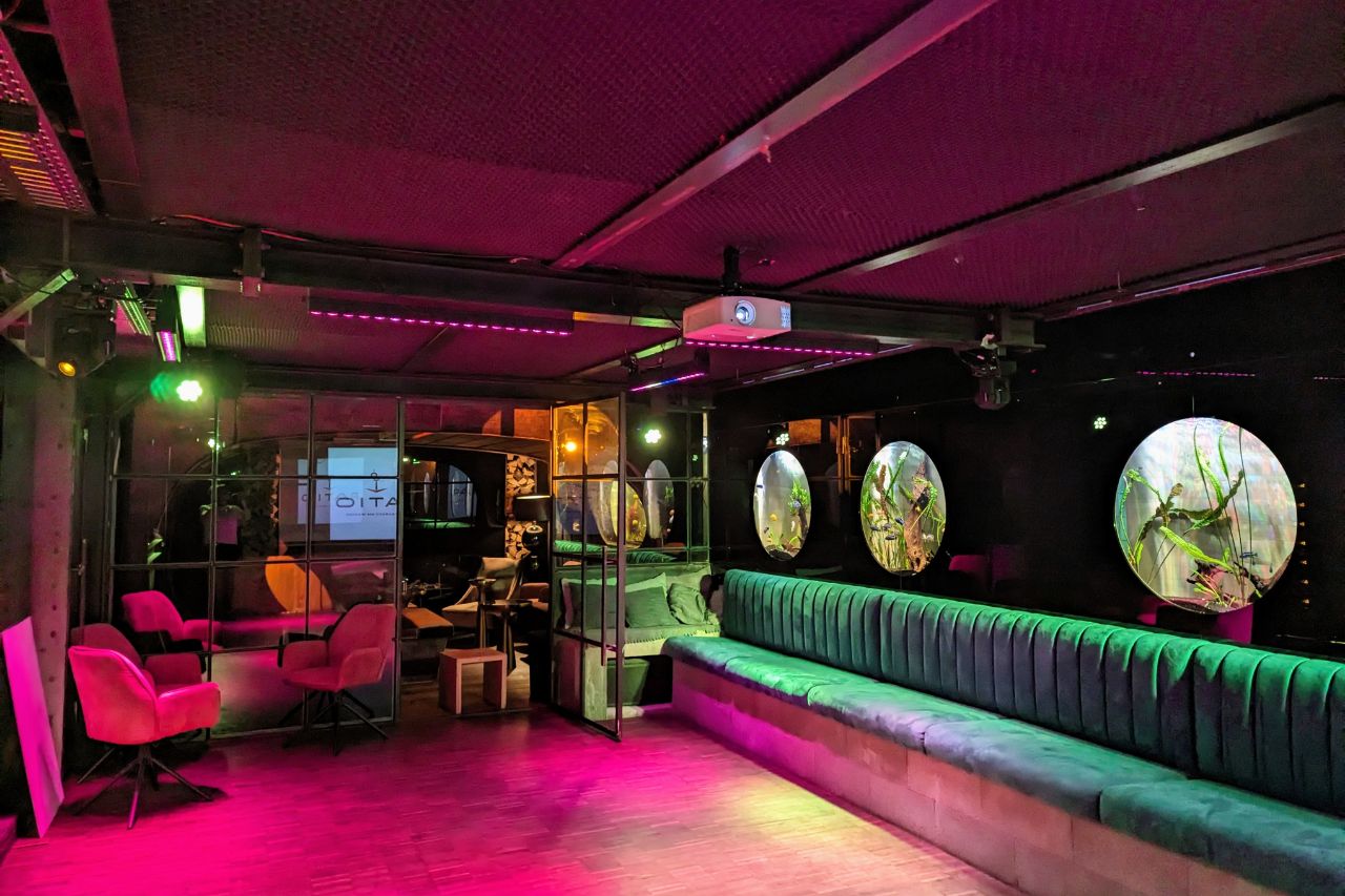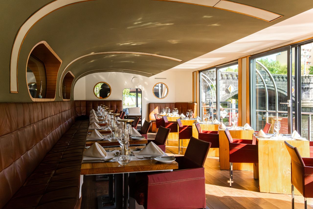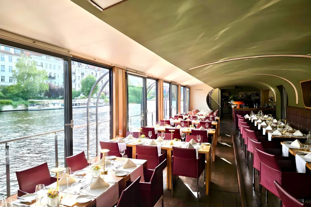 Das lichtdurchflutete Oberdeck mit Blick auf die Spree eignet sich besonders für Empfänge, Sommerfeste oder gesetzte Dinner im Freien. Das Mitteldeck bietet eine elegante Umgebung für Tagungen, Menüveranstaltungen oder Präsentationen. Die Bilge-Bar im Unterdeck ist das stimmungsvolle Zentrum für den späteren Abend: mit eigener Bar, angenehmem Licht und ausreichend Platz für Musikformate oder Afterwork-Events mit Tanzfläche. Sie bietet sich als separater Bereich für Get-togethers oder als zweite Phase einer Veranstaltung an – flexibel bespielbar und mit besonderer Atmosphäre.