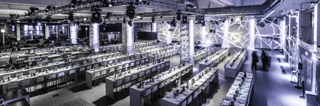 | Hauptraum VOLLGUTLAGER | 360°-Tour - | Raumfläche 1100 m² | Raumhöhe 7.46 m | Max. Bankettbestuhlung 500 | Max. parlamentarische Bestuhlung 0 | Max. Sitzplatzkapazität 1100 | Max. Sitzplätze in Reihe 600 | Max. Stehplätze 1200 | Max. U-förmige Sitzanordnung 0 |